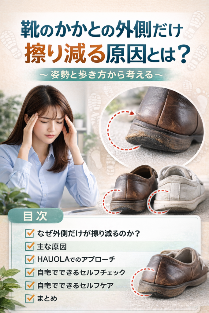 靴のかかとの外側だけがすり減るのは、歩行の癖や骨盤・股関節の歪みが背景にあります。